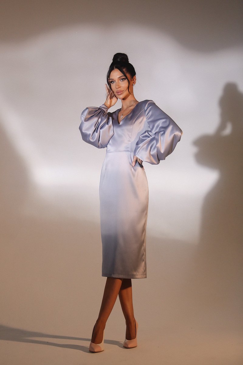 Viclans Satin Midi Gray Dress with Puffy Sleeves