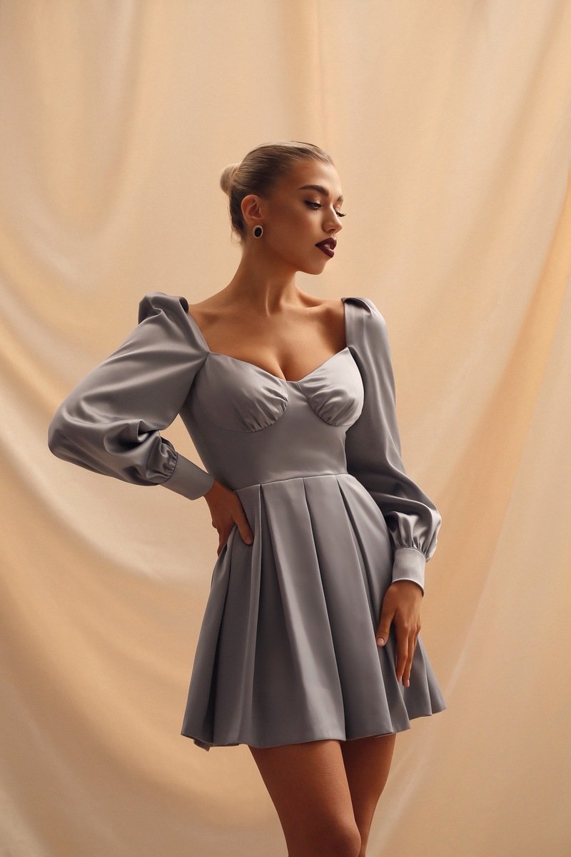 Viclans Satin Gray Dress with Corset Effect and Pleated Skirt