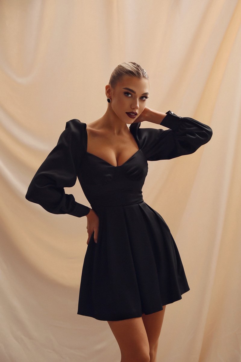 Viclans Satin Black Dress with Corset Effect and Pleated Skirt