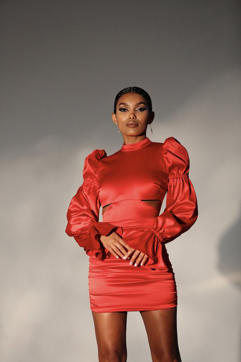 Viclans Draped Satin Mini Orange Dress with Split Waist