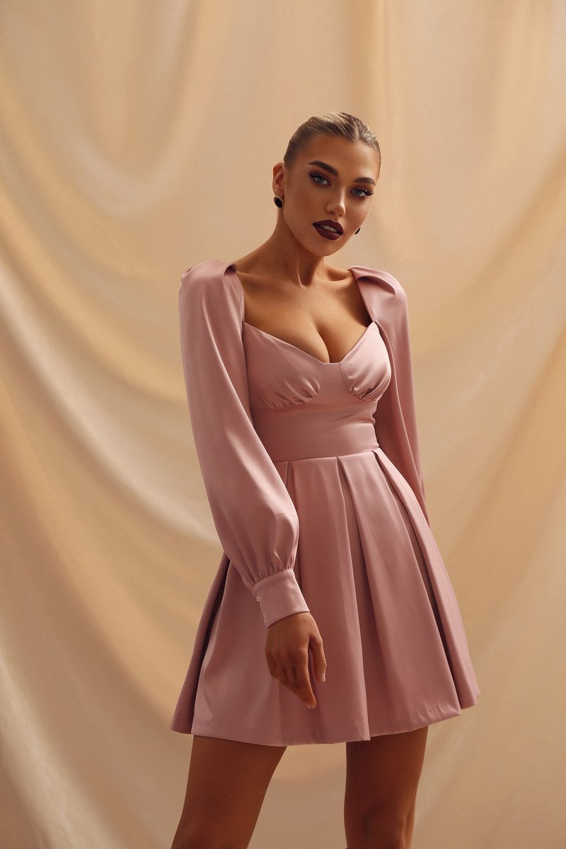 Viclans Satin Pink Dress with Corset Effect and Pleated Skirt