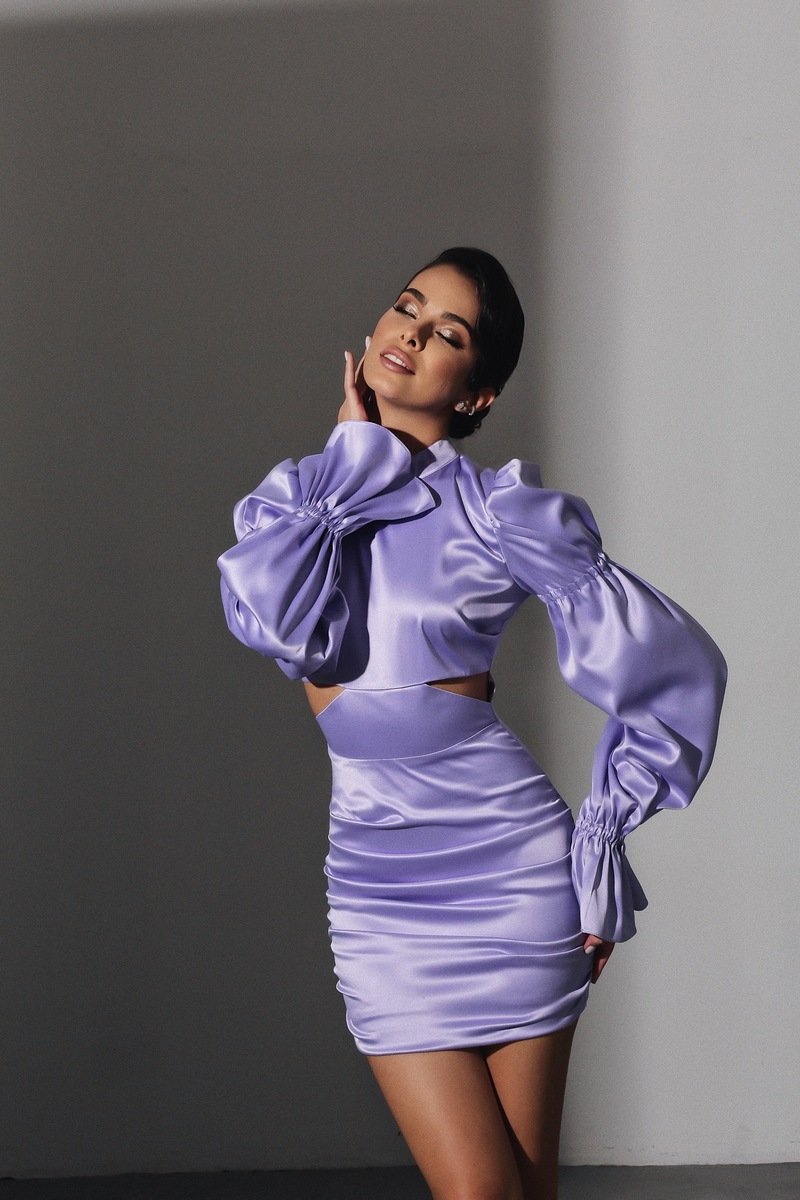Viclans Draped Satin Mini Purple Dress with Split Waist